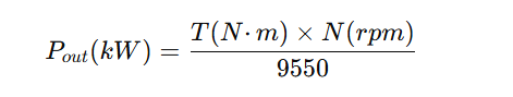 Pout(kW)=T(N⋅m)×N(rpm)9550P_{out} (kW) = \frac{T(N·m) \times N(rpm)}{9550}